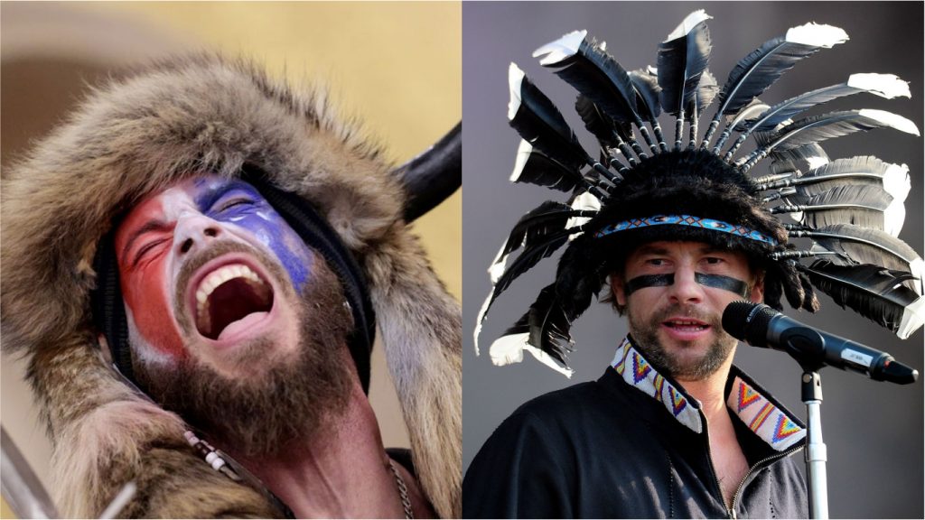 Y entre la multitud, un manifestante llamó la atención por su atuendo, ya que el hombre lucía con el pecho desnudo y una especie de casco con cuernos y pieles de animales, muy parecido al que Jay Kay suele usar.