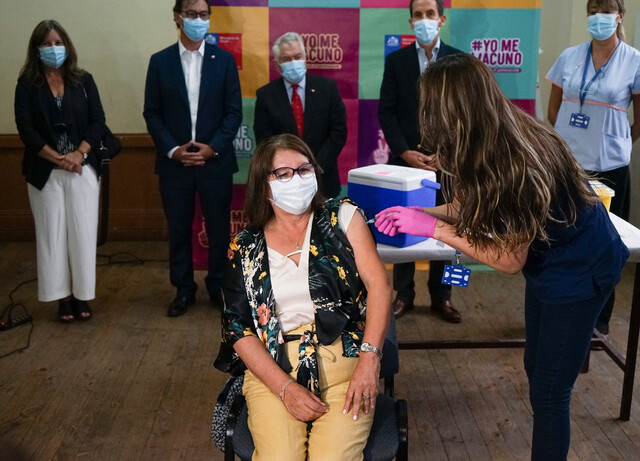 La profesora de la Escuela República de Alemania, Gloria Alfaro Segovia, fue la primera en inocularse, expresando que “se abre una luz de esperanza para nosotros, para que volvamos a encontrarnos en un tiempo adecuado con nuestros niños”.