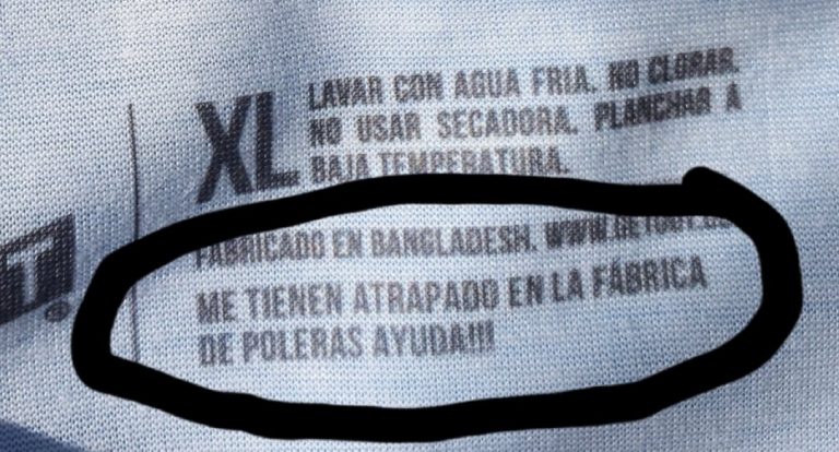 “¡Me tienen atrapado en la fábrica de poleras, ayuda!”, se puede leer en la parte de la indicaciones de cuidado y talla.