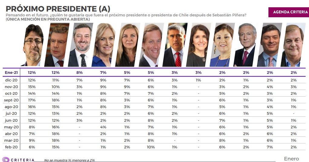 Según la encuesta Criteria del pasado 4 de febrero, la competencia por el primer lugar entre los alcaldes Daniel Jadue y Joaquín Lavín sigue siendo estrecha, con un 12% de preferencias cada uno en menciones espontaneas.