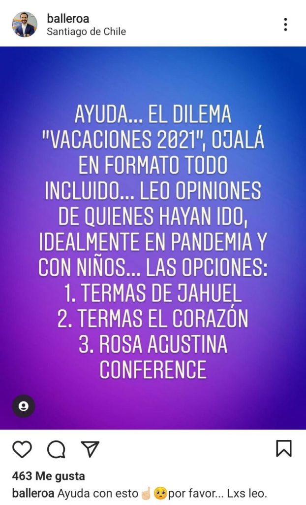 "Ayuda… El dilema 'Vacaciones 2021' ojala en formato todo incluido… Leo opiniones de quienes hayan ido, idealmente en pandemia y con niños… Las opciones: 1. Termas de Jahuel, 2. Termas El Corazón, 3. Rosa Agustina", escribió el ex Protagonista de la Fama.