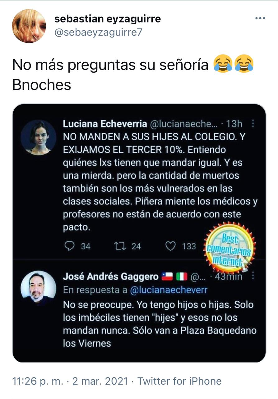 Recibiendo diversas respuestas, una de ellas no pasó desapercibida: El periodista y ex panelista de CQC, Sebastián 'Cuchillo' Eyzaguirre respondió con un tono sarcástico. “No más preguntas su señoría. Bnoches”, escribió.