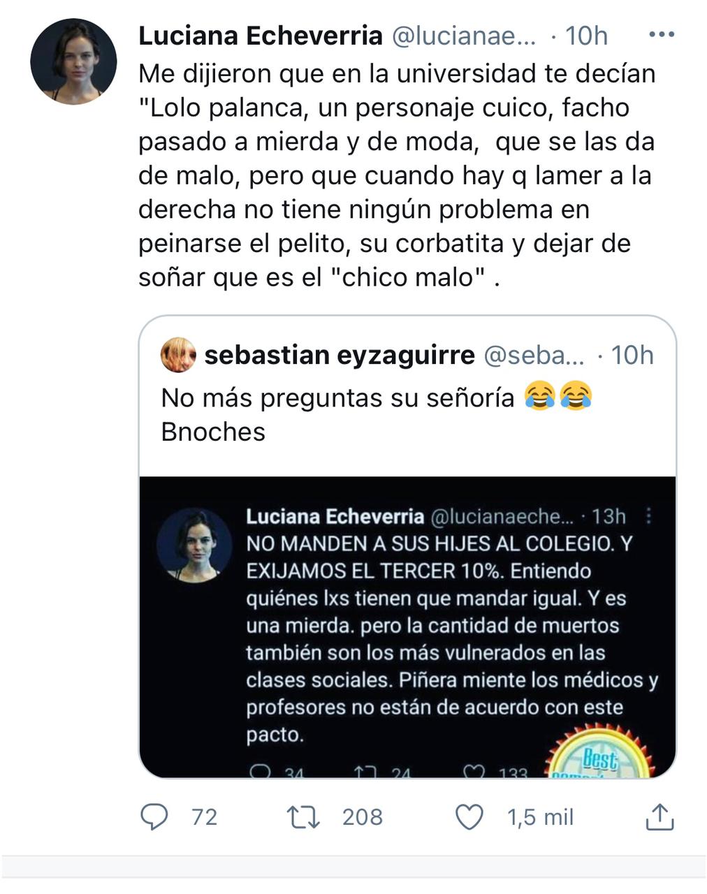 Así, Luciana Echeverría se fue con todo en contra del ex notero: “Me dijeron que en la Universidad te decían el Lolo Palanca, un personaje cuico, facho, pasado a mierda y de moda, que se las da de malo, pero que cuando hay que lamer a la derecha no tiene ningún problema en peinarse el pelito, su corbatita y dejar de soñar que es el chico malo”.