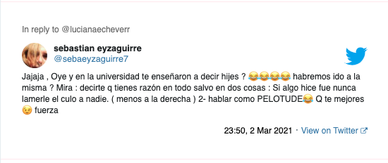 Y finaliza señalando “jajaja, oye y en la Universidad te enseñaron a decir hijes? Habremos ido a la misma? Mira: decirte q tienes razón en todos salvo en dos cosas: si algo hice fue nunca lamerle el culo a nadie (menos a la derecha) 2- hablar como PELOTUDE. Q te mejores…fuerza"