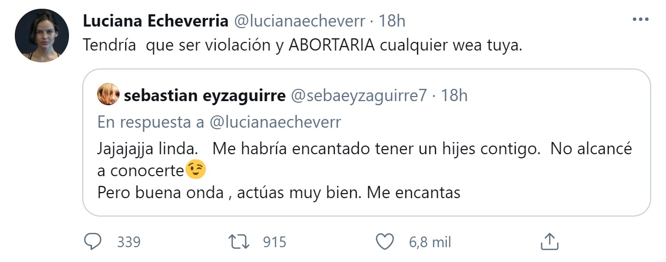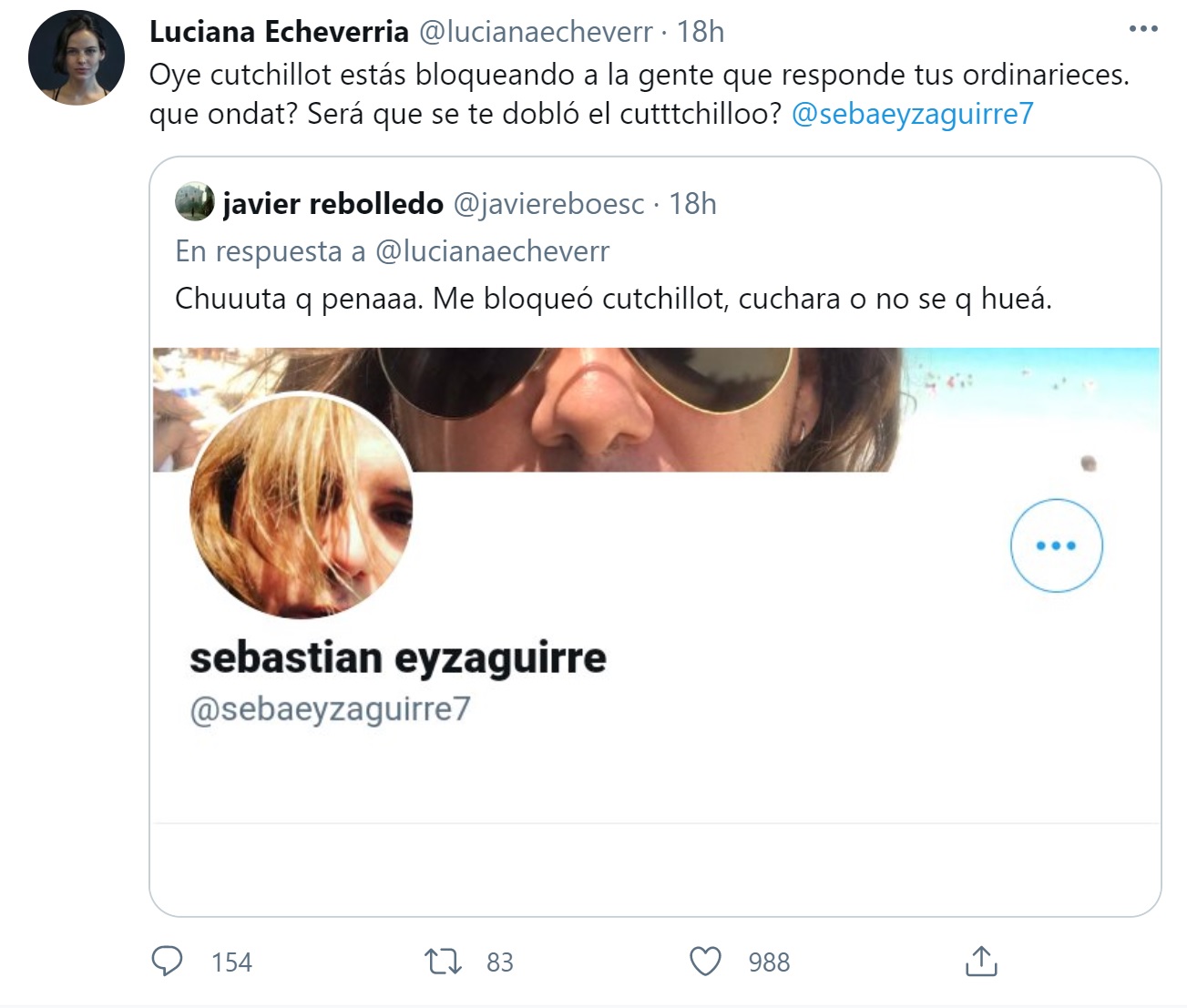 Pero Luciana no se quedó callada, pues a esto respondió: "Tendría que ser violación y ABORTARIA cualquier wea tuya" y, al notar que el periodista comenzó a bloquear tuiteros por esta discusión, le indicó: "Oye cutchillot estás bloqueando a la gente que responde tus ordinarieces. que ondat? Será que se te dobló el cutttchilloo?".