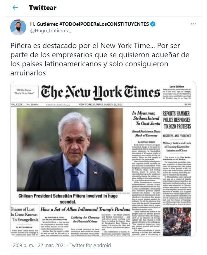 Gutiérrez acompañó la fotografía con la siguiente declaración: "Piñera es destacado por el New York Time... (sic) Por ser parte de los empresarios que se quisieron adueñar de los países latinoamericanos y solo consiguieron arruinarlos".