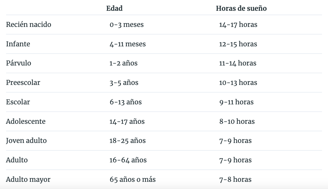 En cuanto a los horarios recomendados, los expertos dicen que los bebés, niños y adolescentes necesitan un sueño de más de 8 horas diarias. Así como también, existe la creencia de que las personas de edad avanzada necesitan menos horas de sueño. Según la Fundación Nacional del Sueño de Estados Unidos, un adulto mayor duerme un poco menos de 7 a 8 horas.