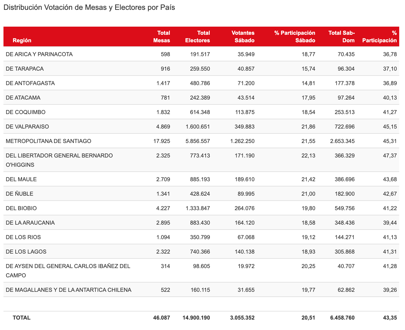 Más de 14 millones 900 mil ciudadanos chilenos estaban habilitados para sufragar en estas elecciones. Solo 6 millones 108 acudieron al llamado.