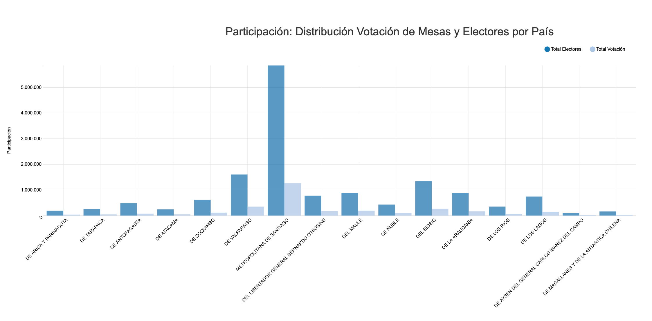 La Región de O'Higgins es la que registró mayor porcentaje de participación con 46,92%. Mientras que la Región de Tarapacá obtuvo la menor proporción de votantes en estos comicios, con 33,74%.