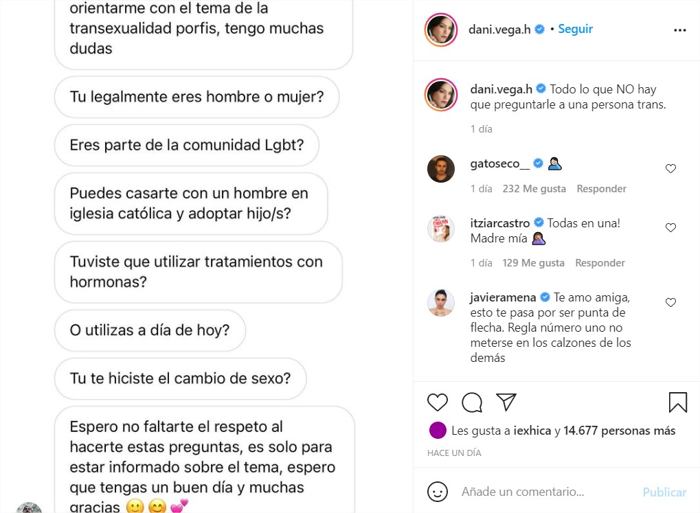 Como indica Radio Futuro, la actriz de 31 años compartió una captura de una conversación con un usuario de Instagram que le realizaba una serie de preguntas que tituló como: "Todo lo que no hay que preguntarle a una persona trans".