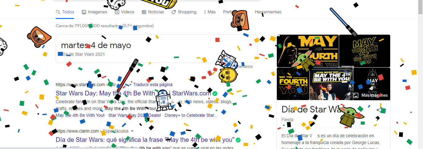 El buscador web colocó uno de sus famosos 'doodle' para los fanáticos de la 'Guerra de las galaxias'. De esta forma, todo aquel que busque 'May the 4th be with you' o algo relacionado a este día, se encontrará con una entretenida animación.