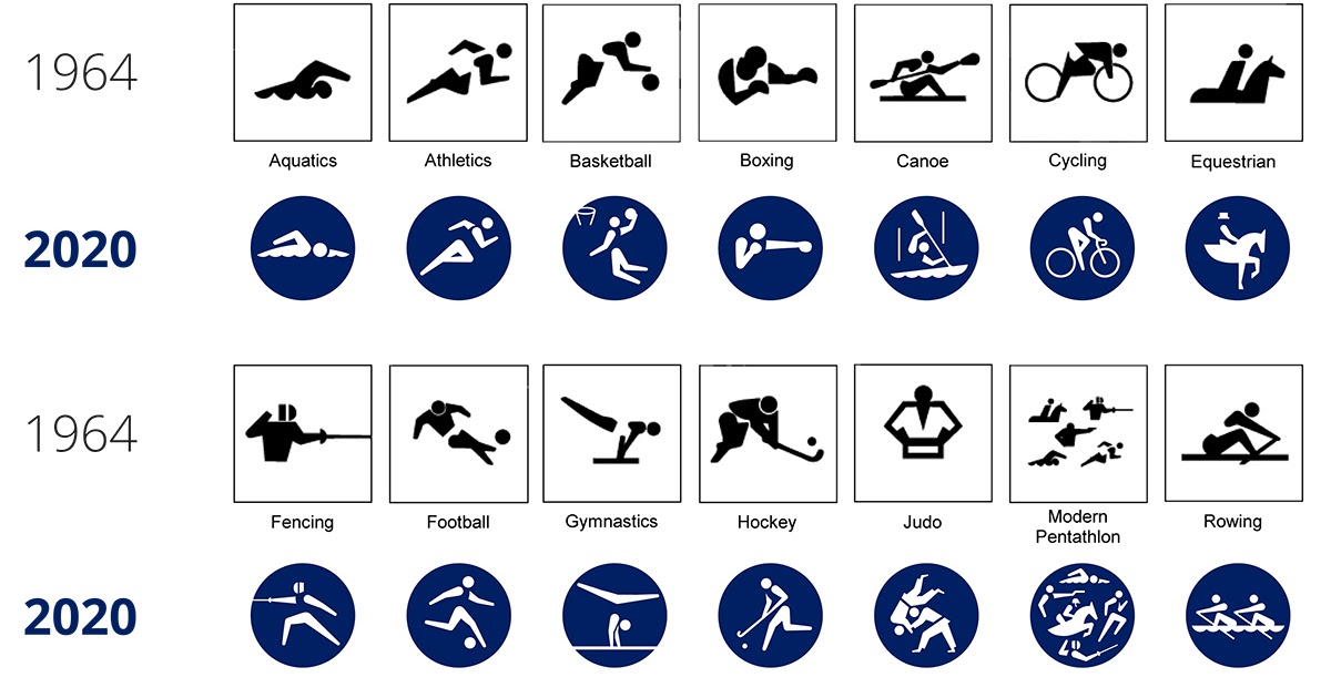 Los pictogramas deportivos estáticos se introdujeron por primera vez en los Juegos de Tokio 1964, y surgieron de la necesidad de comunicarse de una forma visual con los atletas y los espectadores internacionales.
