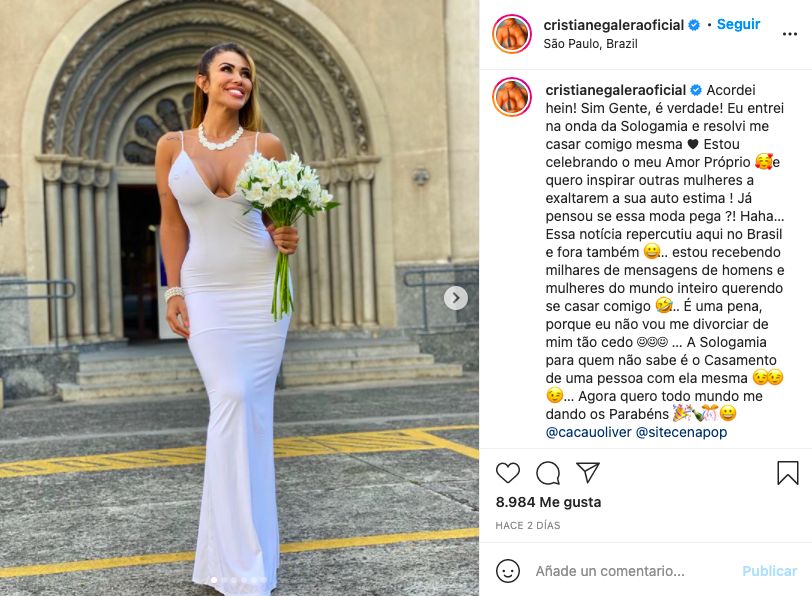 "Me subí a la ola de sologamia y decidí casarme ¡Estoy celebrando mi amor propio y quiero inspirar a otras mujeres a exaltar su autoestima!", escribió en su Instagram. Y así fue, la modelo se casó con ella misma y compartió imágenes de su celebración.