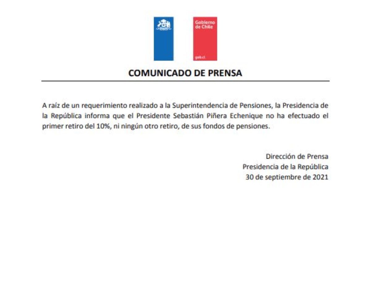 “A razón de un requerimiento realizado a la Superintendencia de Pensiones; la Presidencia de la República informa que el Presidente Sebastián Piñera no ha efectuado el primer retiro del 10%, ni ningún otro retiro, de sus fondos de pensiones”; señala la declaración.