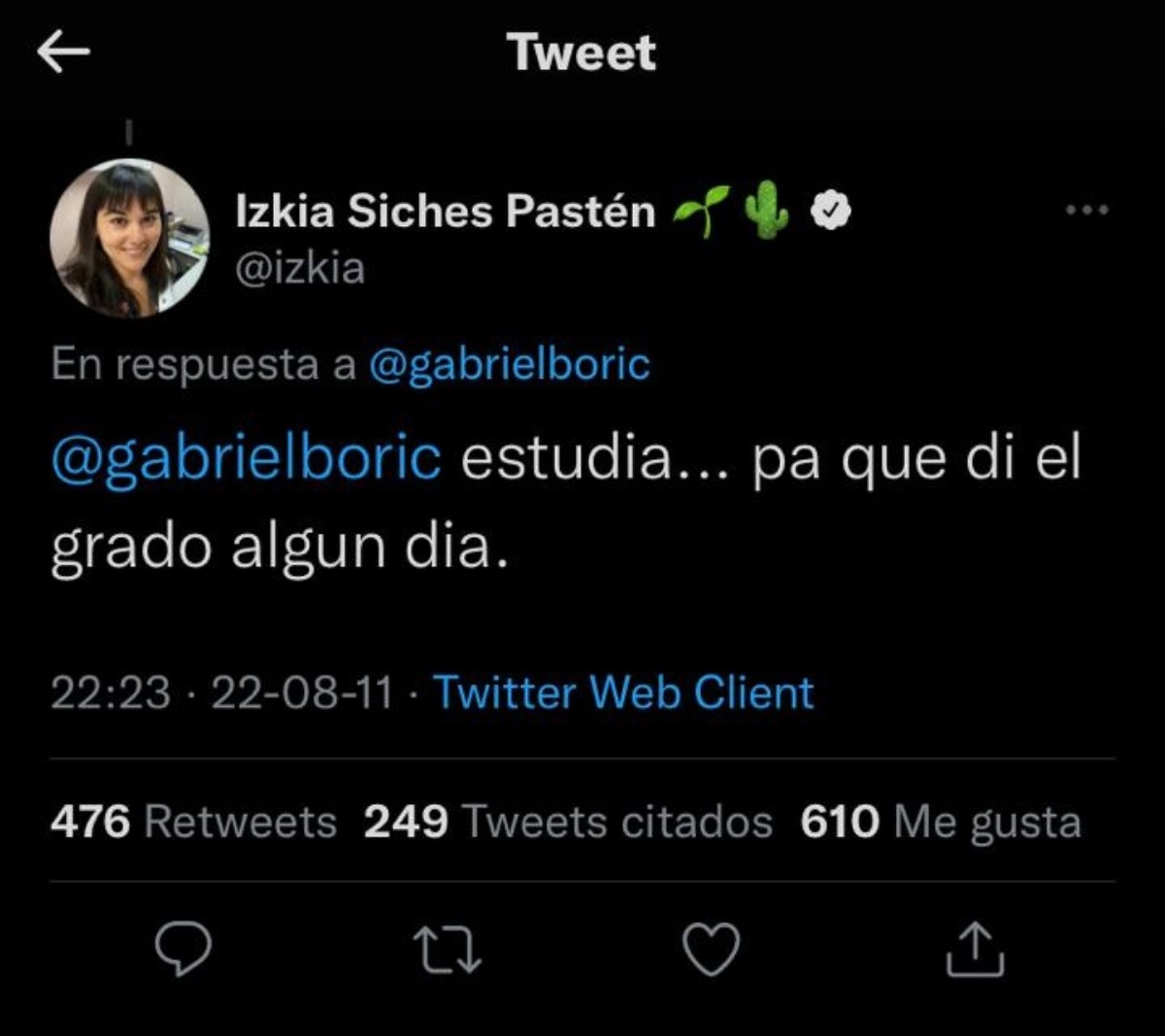 En un tuit, ya borrado, de 2011, la flamante jefa de campaña del candidato Gabriel Boric, Izkia Siches, lo mandó a estudiar para dar el grado algún día.