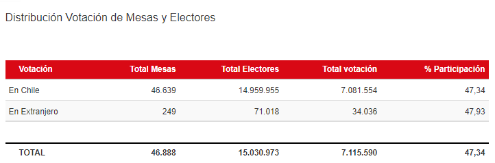 Más de 14 millones 900 mil ciudadanos chilenos estaban habilitados para sufragar en estas elecciones. Solo 6 millones 108 acudieron al llamado.