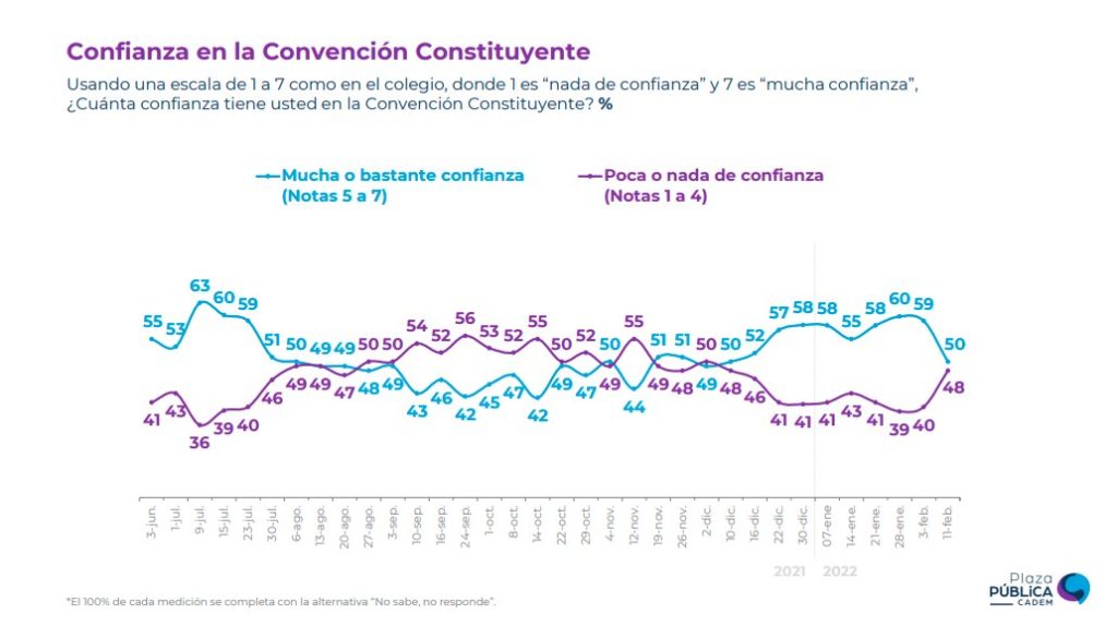 Sobre la confianza en la Convención, un 50% de los encuestados dijo confiar mucho o bastante, mientras un 48% señaló confiar poco o nada. Este parámetro también bajó respeto al 59% de confianza registrado en los datos del 3 de febrero.