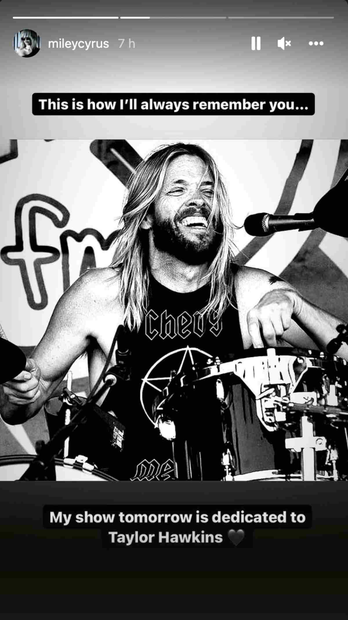 "Así es como siempre te recordaré", escribió en su Instagram Stories durante la noche del viernes junto a una foto de Hawkins tocando la batería, añadiendo: "Mi show de mañana está dedicado a Taylor Hawkins".