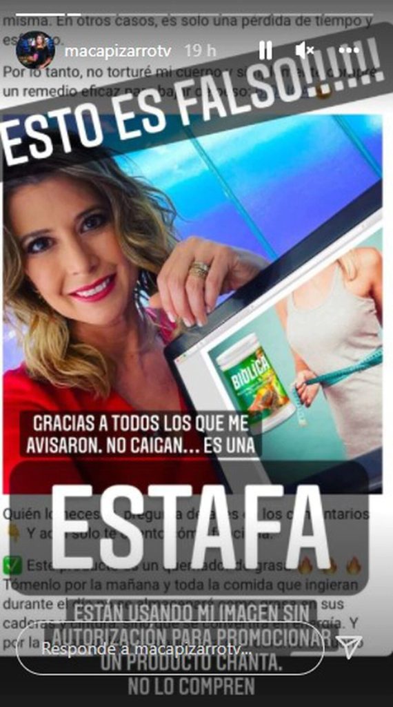 Macarena Pizarro advirtió a sus seguidores de un producto que utiliza su imagen para promocionarse y que se trataría de una estafa.