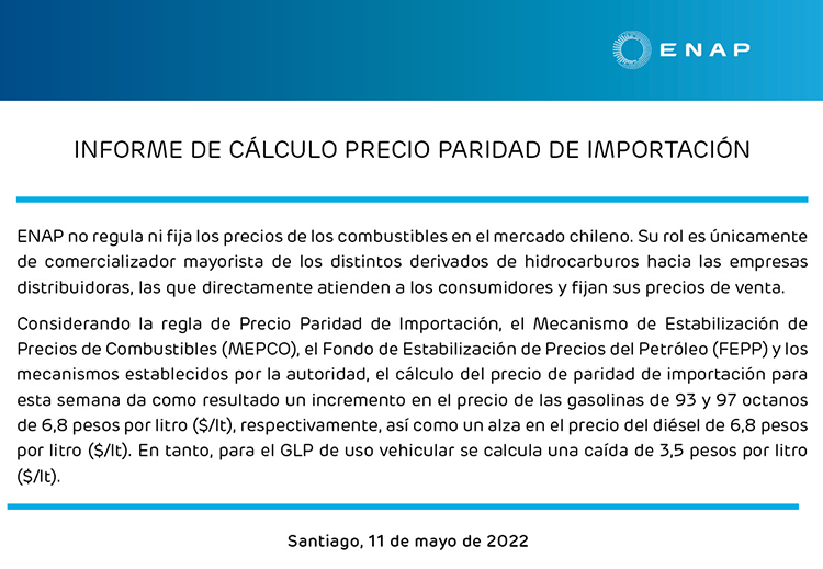 La Empresa Nacional del Petróleo, en su entrega semanal, dio a conocer los motivos del aumento que experimentarán los precios de las bencinas, explicando que la proyección se realiza "considerando la regla de Precio, Paridad de Importación, el Mecanismo de Estabilización de Precios de Combustibles (Mepco), el Fondo de Estabilización de Precios del Petróleo (FEEP) y los mecanismos establecidos por la autoridad".