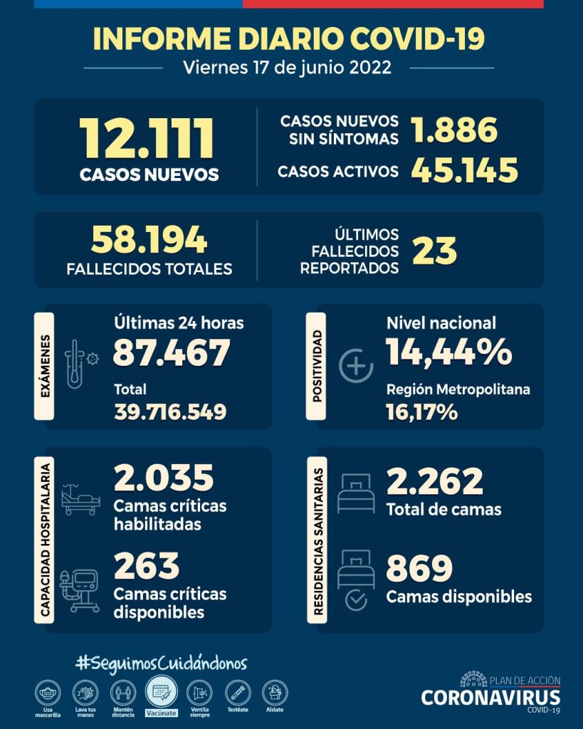Específicamente, se registraron 12.111 casos, con una positividad de 14,44% en las últimas 24 horas a nivel nacional, con 87.467 exámenes, PCR y test de antígeno. La positividad diaria en la Región Metropolitana es de 16,17%.