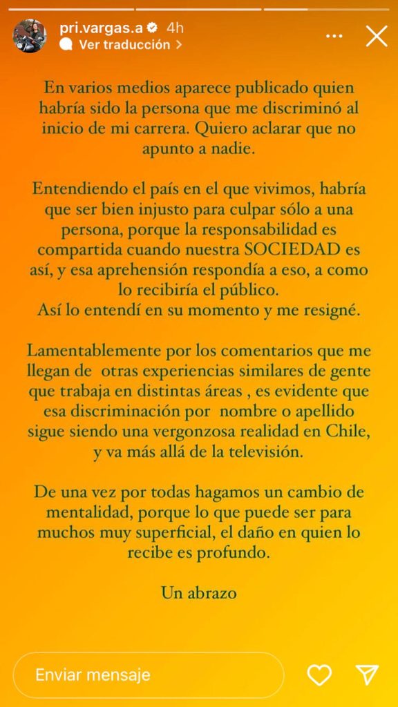“Es evidente que esa discriminación por nombre o apellido sigue siendo una vergonzosa realidad en Chile, y va más allá de la televisión”, agregó la periodista. Para finalizar, la animadora pidió que “de una vez por todas hagamos un cambio de mentalidad, porque lo que puede ser para muchos muy superficial, el daño en quien lo recibe es profundo”.