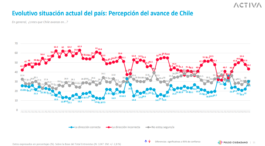 Además, un 30,1% piensa que el país va en la dirección correcta y un 43,2% considera que va en la dirección incorrecta. En tanto, un 24,5% opina que Chile progresa, un 39,1% que está estancado y un 31% que retrocede.