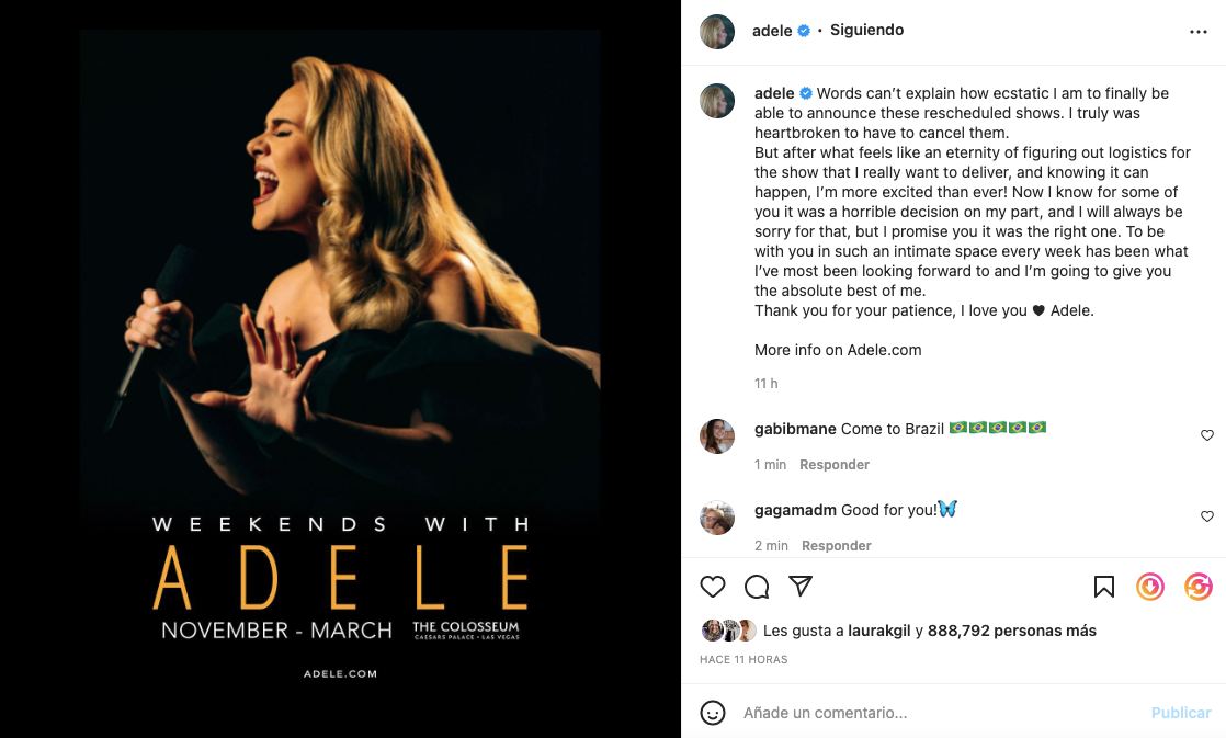 Adele anunció este lunes las nuevas fecha de sus conciertos Weekends With Adele en Las Vegas después de haberlos pospuesto un día antes de su inicio a comienzos de año.