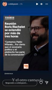 En la instancia Boric reveló que habían estado entonando éxitos de Pablo Milanés, lo que hizo que Coté López pusiera en sus redes un irónico “y el otro cantando...”.