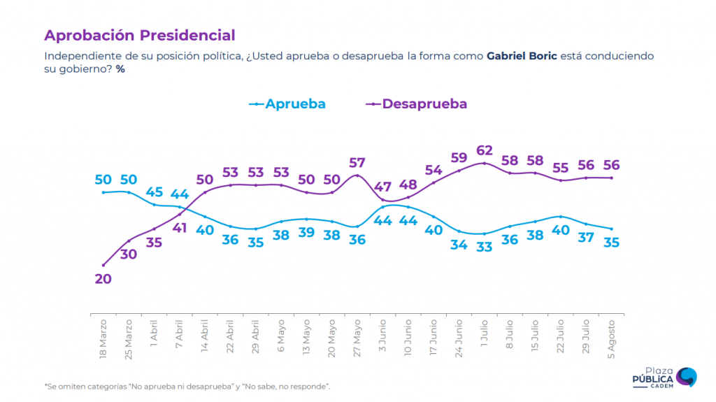 Ante la evaluación hacia el Ejecutivo, un 56% desaprueba la gestión del presidente Gabriel Boric, mientras que solo un 35% aprueba el trabajo que está realizando desde La Moneda.
