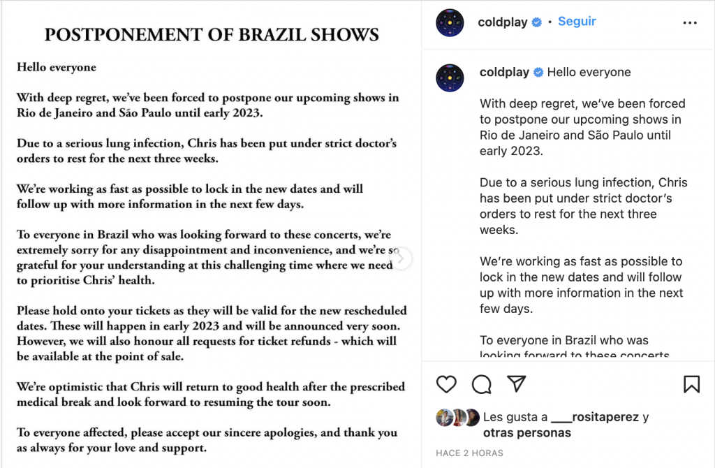 La legendaria banda, liderada por Chris Martin, anunció la mañana de este martes que se vieron forzados a cancelar los próximos shows en Brasil por una infección pulmonar del vocalista.