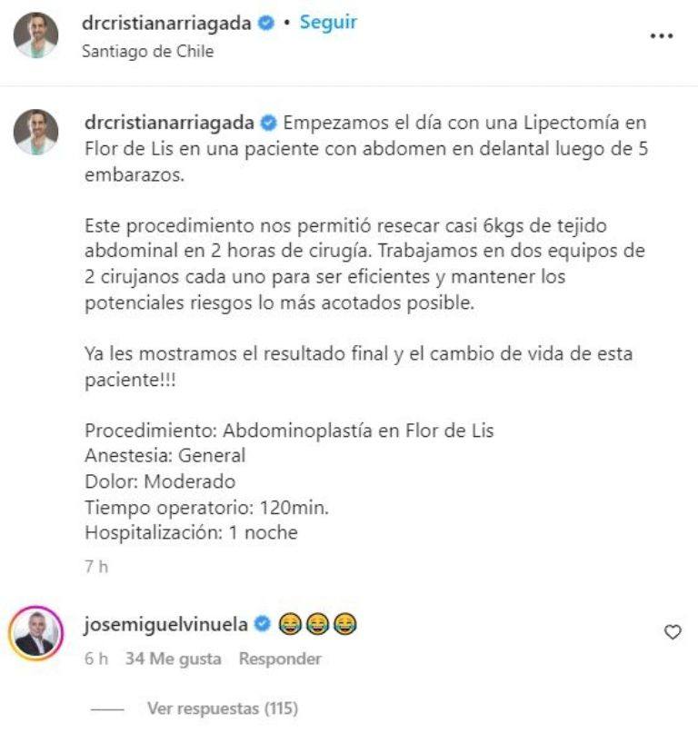 Todo partió con la publicación en Instagram del doctor Cristián Arriagada, viudo de Javiera Suárez. Y es que, según consignó La Hora, el periodista reaccionó al registro que el cirujano subió a sus redes donde mostraba los resultados de haberle quitado varios kilos a una paciente. El tono del médico era bastante serio y hablaba de una operación compleja. De esa forma, mostró dos bolsas de este tejido abdominal que fueron extraídas en la intervención.