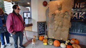 El domingo, la escultura se expuso en el exterior de su tienda en California junto a un arreglo de calabazas y una pizarra en la que se lee: "Nuestro héroe Pan Solo ha sido atrapado en Levainita por el malvado Jabba the Hutt".