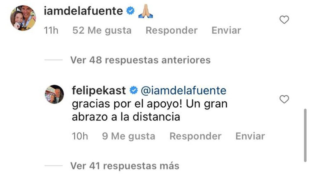 En el video que el parlamentario compartió en Instagram, Cristián de la Fuente comentó un emoji de dos manos simpatizando con Kast. Frente a este, el senador Evópoli le respondió: "Gracias por el poyo! Un gran abrazo a la distancia".