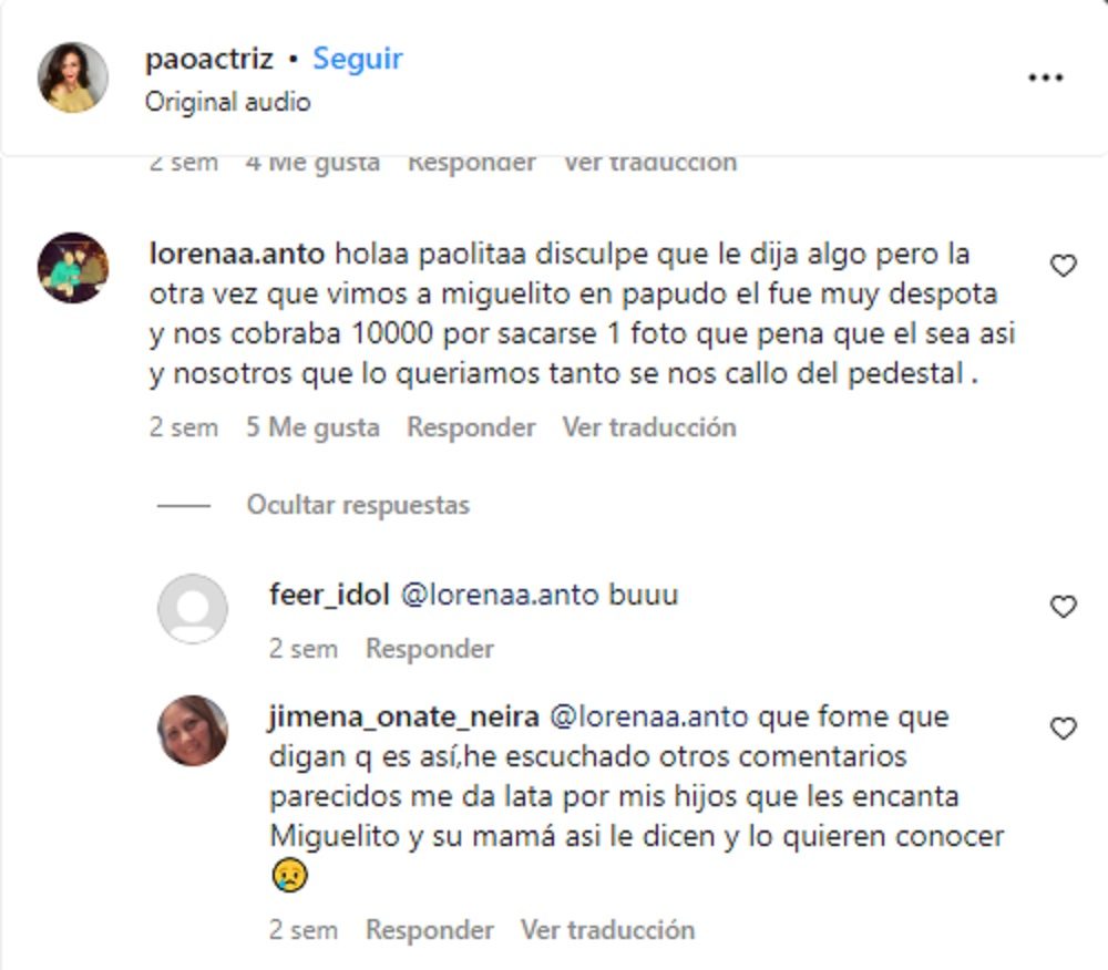 En estos se acusaba a Malpartida de tener una mala reacción con sus fanáticos. Una usuaria escribió "hola Paola, disculpe que le diga algo, pero la otra vez que vimos a Miguelito en Papudo, él fue muy déspota".