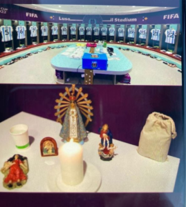 Finalmente, mostró cómo luce el camarín de la selección argentina, con un altar que tiene a la virgen de Luján y a la difunta Correa, además de un vaso de agua que es lo que ella siempre recomienda.