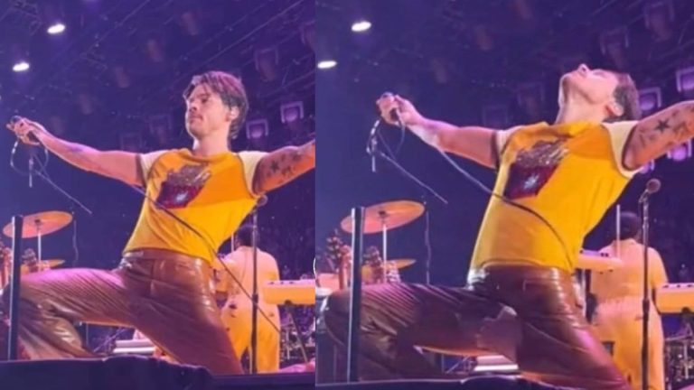 Según un video compartido en Twitter por un asistente al concierto, el accidente ocurrió cuando el cantante se arrodilló sobre una rodilla, lo que instantáneamente rompió la costura de sus pantalones en el proceso. Después de notar el accidente, Styles continuó cantando tímidamente mientras cubría el desgarro.
