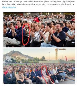 Sin embargo, un usuario de la plataforma comparó dos imágenes del evento en la que acusó a Matthei de eliminar a la alcaldesa de Santiago en sus imágenes publicadas.