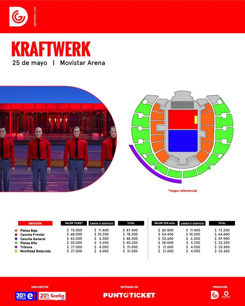 La preventa para el show de Kraftwerk en el Movistar Arena el 25 de mayo de 2023 comenzará este miércoles 15 de febrero a las 11 AM en PuntoTicket. En esta ocasión existirá un descuento exclusivo de 20% para clientes Entel o pagando con Tarjetas Scotia.