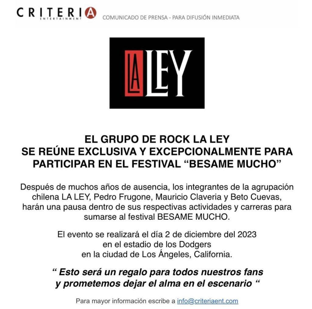 Después de muchos años de ausencia, los integrantes de la agrupación chilena regresarán a los escenarios. La Ley de presentará, "de forma excepcional", en el festival Bésame Mucho el 2 de diciembre de este año. Sin embargo, la banda no se presentará en Chile, sino en el estadio de Los Dodgers, en la ciudad de Los Ángeles, California.