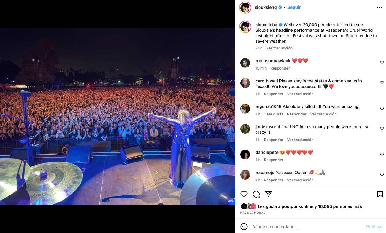 Shirley Manson, líder de Garbage, aprovechó la ocasión para expresar su admiración hacia Sioux, quien ha sido una fuente de inspiración para ella. "Porque sin ella, no existiría yo", escribió Manson en el mensaje dirigido a la influyente cantante.