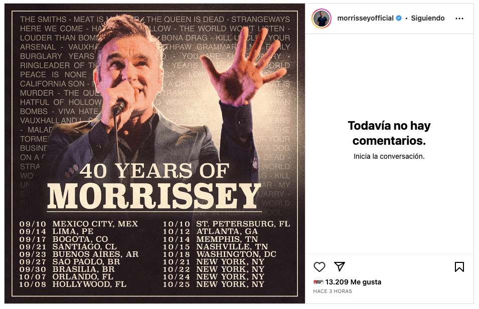 El concierto de Morrissey en Chile está programado para el 21 de septiembre. Esto según reveló una publicación en su cuenta de Instagram que rápidamente se volvió viral.
