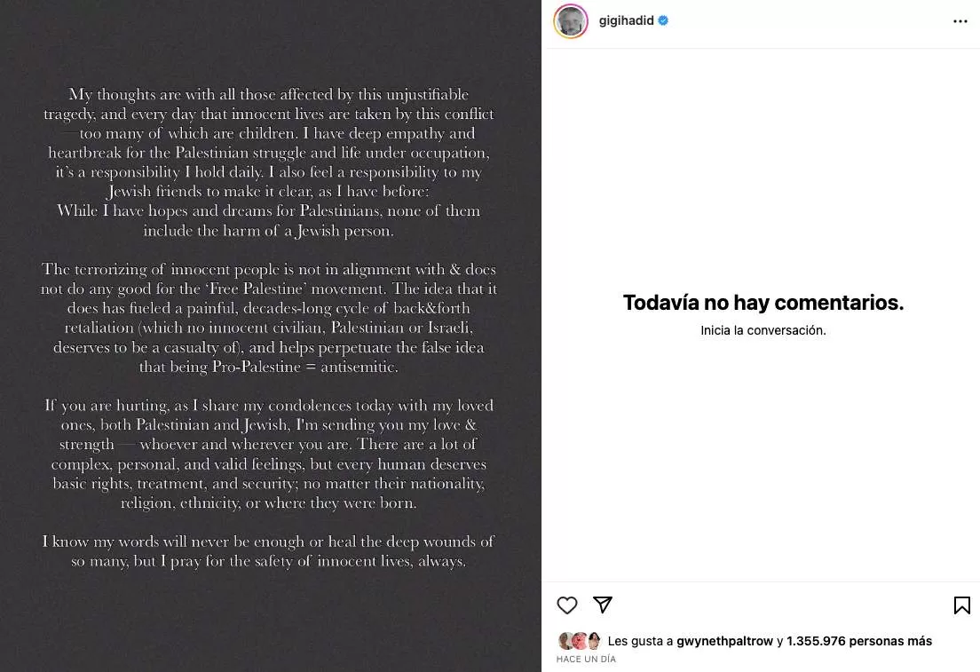La modelo Gigi Hadid, cuyo padre es palestino, reafirmó su apoyo a la causa palestina, pero instó a no dañar a personas inocentes.