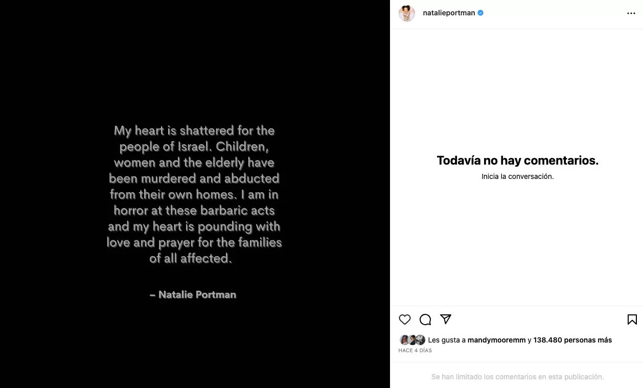 Natalie Portman, otra actriz israelí, compartió su corazón roto por el sufrimiento en Israel y su deseo de paz.
