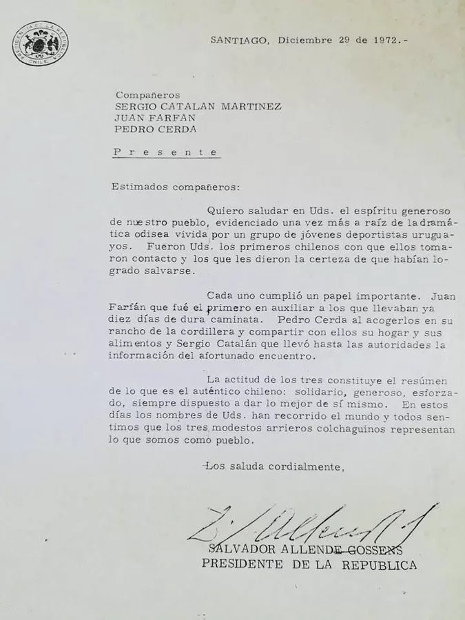"Estimados compañeros: Quiero saludar en Uds. el espíritu generoso de nuestro pueblo, evidenciado una vez más a raíz de la dramática odisea vivida por un grupo de jóvenes deportistas uruguayos. Fueron Uds. los primeros chilenos con que ellos tomaron contacto y los que les dieron la certeza de que habían logrado salvarse. Cada uno cumplió un papel importante.