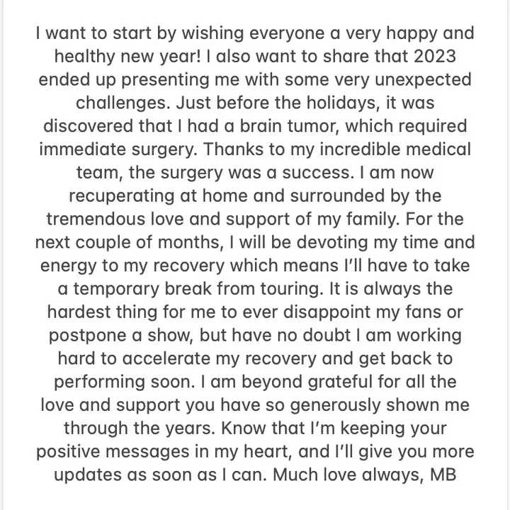 “Gracias a mi increíble equipo médico, la cirugía fue un éxito. Ahora me estoy recuperando en casa y rodeada del tremendo amor y apoyo de mi familia. Durante los próximos meses dedicaré mi tiempo y energía a mi recuperación, lo que significa que tendré que tomarme un descanso temporal de las giras”, agregó el cantante.