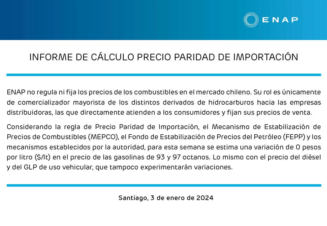El informe siguiente de ENAP, programado para el 10 de enero, revelará las eventuales actualizaciones que entrarán en vigencia a partir del 11 de enero y se extenderán hasta el 18 de enero de 2024.