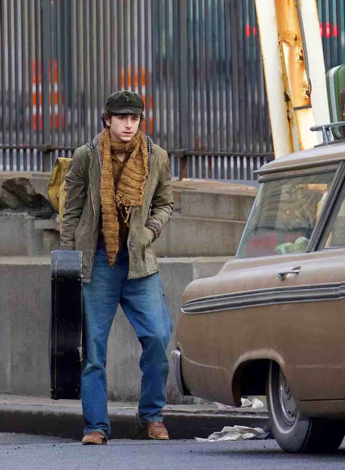 Chalamet se sumergió en el papel de Dylan con un atuendo clásico de los años 60 mientras portaba una guitarra desgastada en su mano.