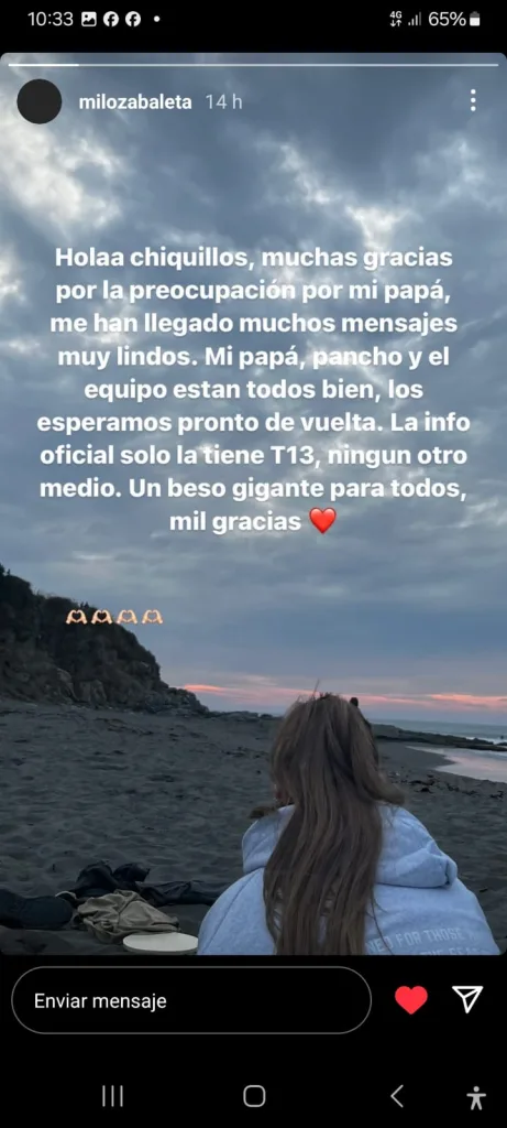La hija de conductor de Catálogo Concierto en nuestra radio, Milagros Zabaleta, compartió un mensaje en sus redes sociales. Además de agradecer por los mensajes de apoyo, aseguró que su padre estaba en perfecto estado.