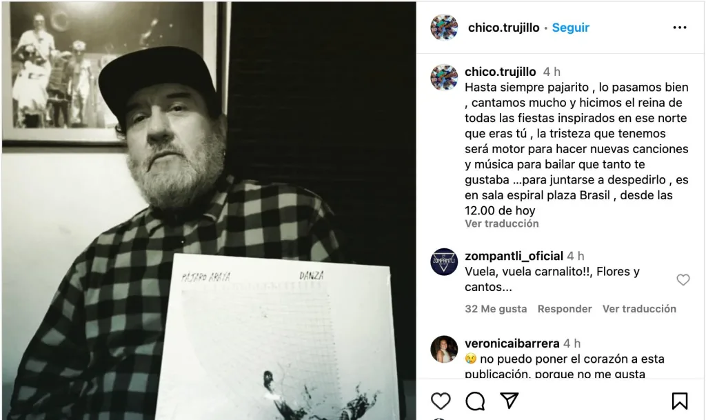 Justamente la agrupación Congreso escribió en redes sociales un emotivo mensaje para el músico. "Querido Pájaro: Nadie se cansa de volar, amigo pájaro, todos seguimos volando en otra parte. Debe existir esa vida eterna aymara y trashumante que te prepara para todo, que te transforma en ekeko, y que lleno de instrumentos y melodías partes volando para regalar como si fuera la pascua"